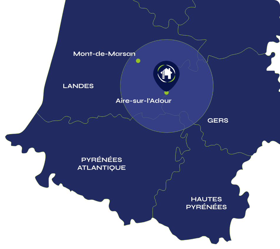 Basés à Cazères-sur-l’Adour, nous intervenons dans un rayon d’environ 30 km : Aire-sur-l’Adour, Mont-de-Marsan, Nogaro et les communes voisines (Barcelonne-du-Gers, Cazères-sur-l’Adour, etc.). Vous êtes un peu plus loin ? Exposez-nous votre projet, on étudie au cas par cas selon la surface et l’accessibilité.